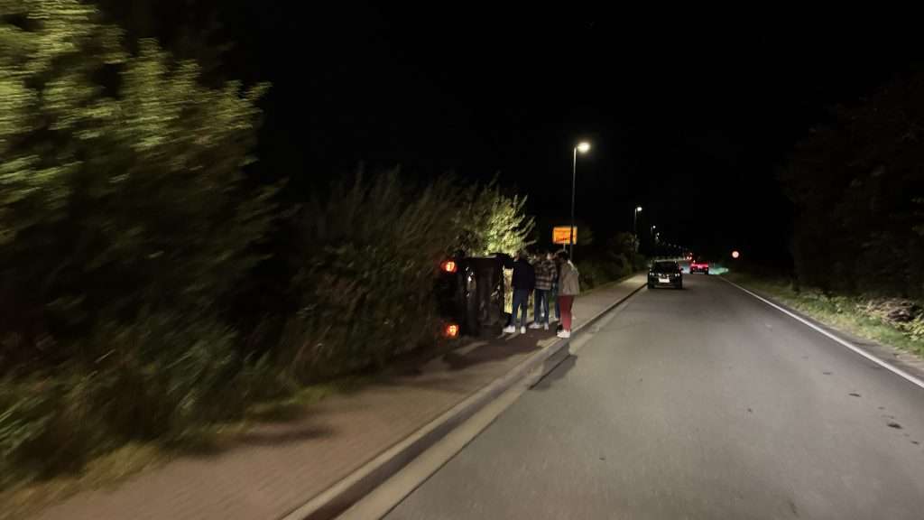 Braderup/Sylt. Gegen 21:50 Uhr ereignete sich an der Ortsausfahrt von Braderup in Richtung Wenningstedt ein Verkehrsunfall. Nach ersten Informationen von der Unfallstelle liegt ein Fahrzeug auf der Seite.