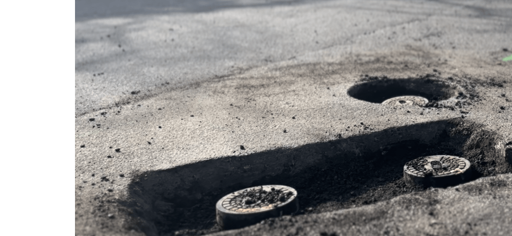 Fahrradfahrer oder Fußgänger könnten sich im Dunkeln verletzen. Die Straße ist nicht abgesperrt und es stehen auch keine Warnschilder vor Ort.