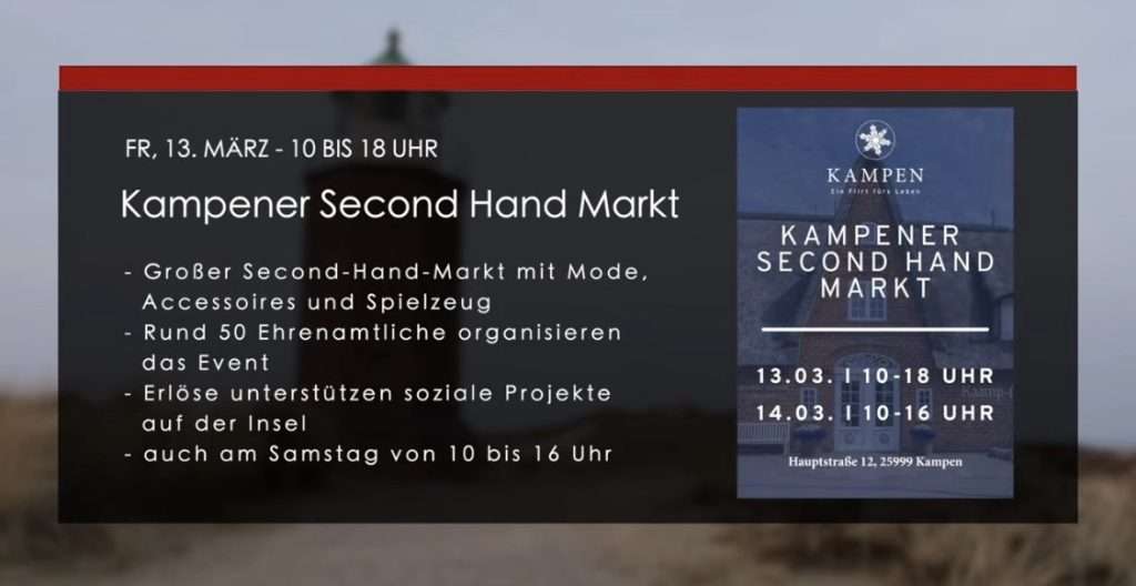 Wer lieber nach echten Schätzen stöbert, sollte den beliebten Secondhandmarkt im Kompüs in Kampen [00:33] nicht verpassen. Kleidung, Accessoires und vieles mehr wechseln hier den Besitzer. Der Markt wird von rund 50 Ehrenamtlichen organisiert und die gesamten Einnahmen fließen in soziale Projekte auf der Insel [00:43]. Geöffnet ist am Freitag von 10:00 bis 18:00 Uhr und am Samstag von 10:00 bis 16:00 Uhr [00:51].